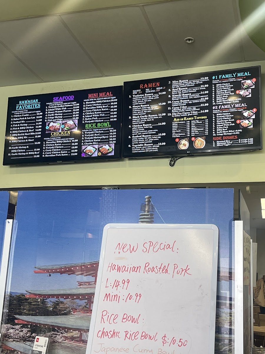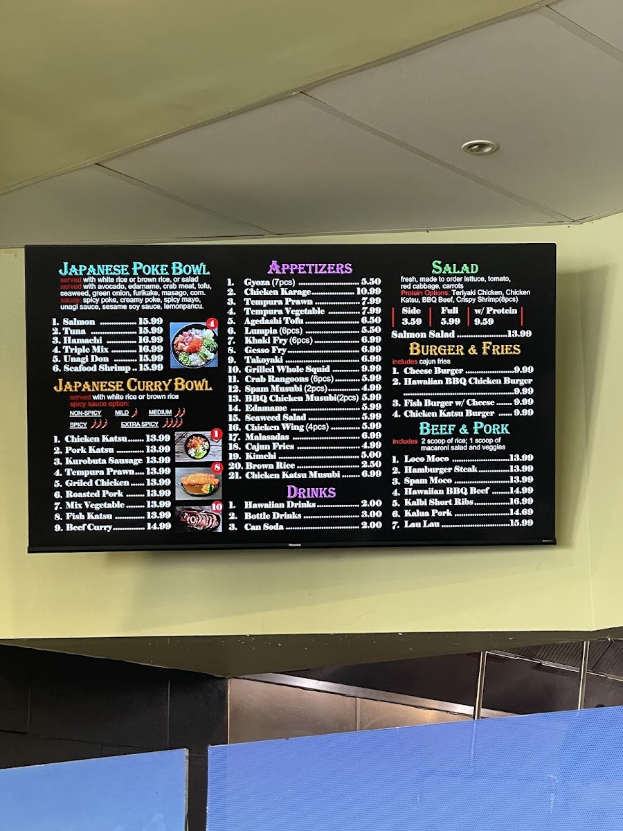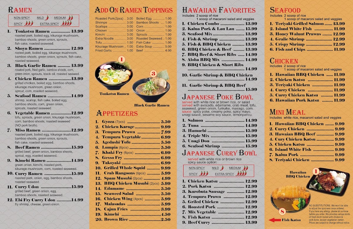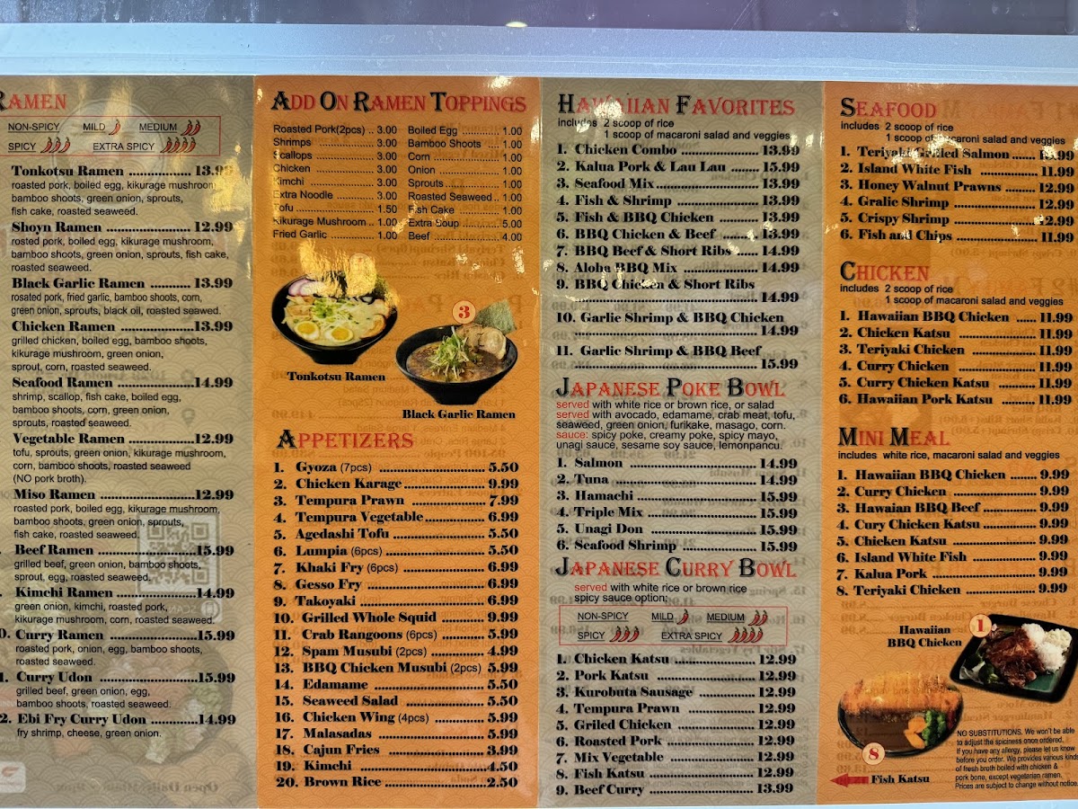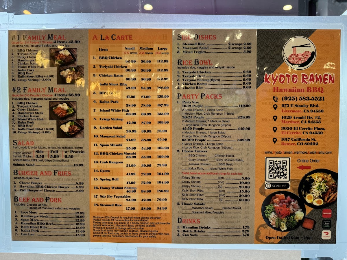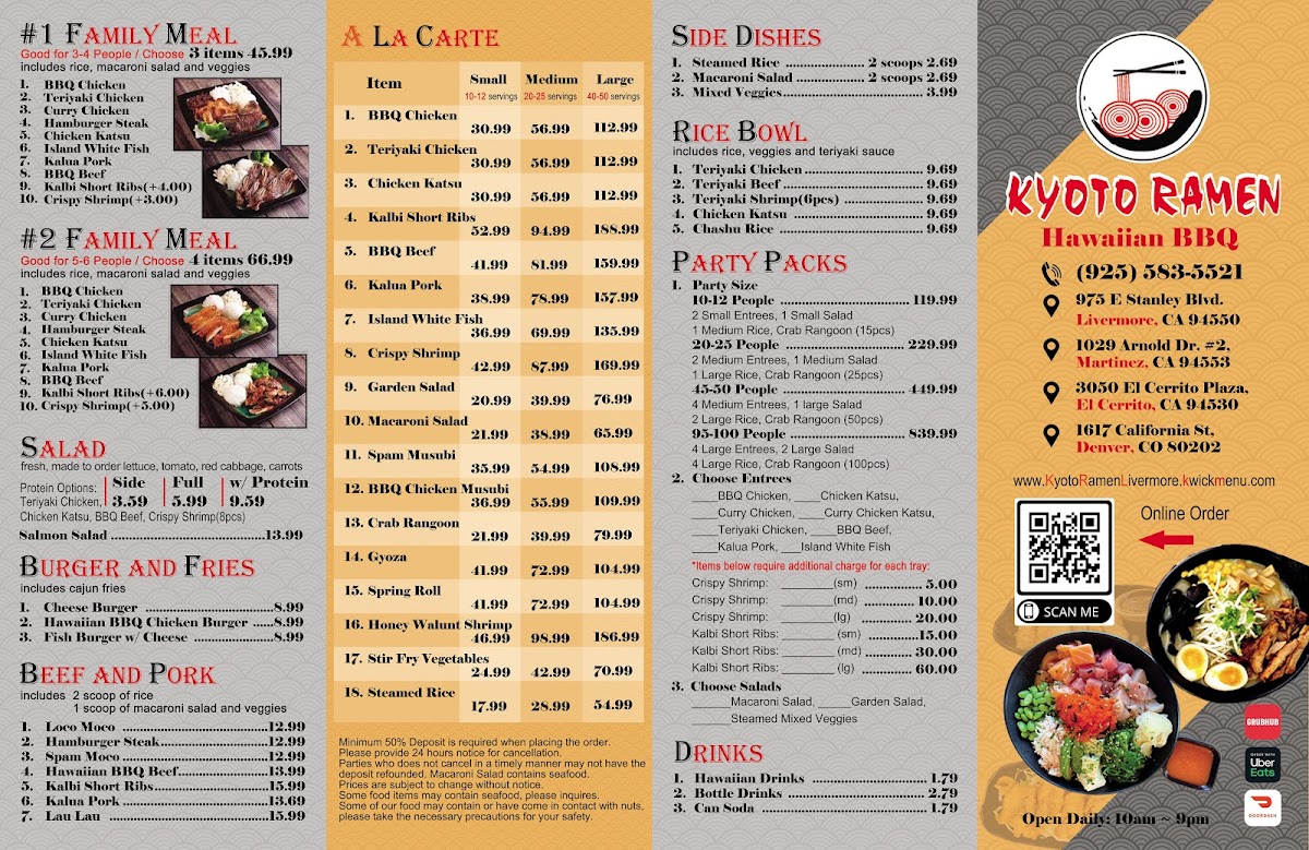 From a reviewer’s perspective, the menu at Kyoto Ramen Hawaiian BBQ offers an impressively wide selection that blends Hawaiian comfort food with Japanese favorites, making it easy to find something satisfying for any craving. The larger group options like Party Size (95-100 People), Party Size (45-50 People), Party Size (20-25 People), and Party Size (10-12 People) are great for gatherings, while smaller portions such as Chicken Katsu (Mini), Hawaiian BBQ Chicken (Mini), Hawaiian BBQ Beef (Mini), Curry Chicken Katsu (Mini), and Curry Chicken (Mini) provide affordable individual choices. The Hawaiian section stands out with combinations like Chicken Combo, Garlic Shrimp & BBQ Chicken, Kalua Pork & Lau Lau, Garlic Shrimp & BBQ Beef, and BBQ Beef & Short Ribs. Ramen lovers can choose from Vegetable Ramen, Beef Ramen, Tonkotsu Ramen, Shoyu Ramen, and Miso Ramen, while rice bowls such as Teriyaki Chicken, Teriyaki Beef, Teriyaki Shrimp (6 Pieces), Chicken Katsu, and Chashu Rice offer filling options. Other highlights include Loco Moco, Spam Moco, Kalbi Short Ribs, Garlic Shrimp, Honey Walnut Prawns, Tuna Poke Bowl, Salmon Poke Bowl, and appetizers like Grilled Whole Squid, Agedashi Tofu, BBQ Chicken Musubi (2 Pieces), and Edamame. Overall, the menu is extensive, flavorful, and well-suited for both quick meals and family-style dining.