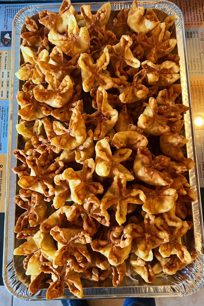 4 medium entrees, 1 large salad, 2 large rice, crab rangoon (50 pieces).